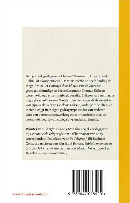 Ben je rood, geel, groen of blauw? Dominant, Inspirerend, Stabiel of Correct? De DISC-methode is dankzij de mega-bestseller Omringd door idioten van de Zweedse gedragsdeskundige en bestsellerauteur Thomas Erikson niet meer weg te denken. Erikson schreef hierna nog vijf vervolgboeken. Wouter van Bergen geeft de essentie van zijn werk weer in De kleine Erikson, zodat je in sneltempo inzicht krijgt in je eigen persoonlijkheidstype en dat van anderen – voor een betere samenwerking en communicatie met collega’s, vrienden en familie.