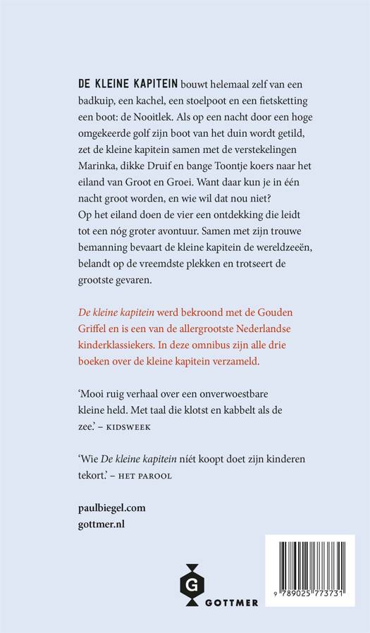 Deze prachtige, geïllustreerde omnibus van 'De kleine kapitein' is een van de meest geliefde kinderboeken uit de Nederlandse jeugdliteratuur, van meesterverteller Paul Biegel. In 2005 was de titel niet voor niets een van de genomineerde kinderboeken voor de prestigieuze Griffel der Griffels.De kleine kapitein bouwt helemaal zelf een boot van een badkuip, een kachel, een stoelpoot en een fietsketting. Hij doopt zijn schip de Nooitlek en begint samen met de drie verstekelingen Dikke Druif, Marinka en Bange Toontje aan een lange, gevaarlijke reis naar het eiland van Groot en Groei. Daar kun je in één nacht groot worden... Toch?Paul Biegel is de meesterverteller van de Lage Landen en een van de meest geliefde stemmen in de Nederlandse jeugdliteratuur. Voor zijn werk nam hij onder andere vier Zilveren Griffels en twee Gouden Griffels in ontvangst, waarvan er een voor 'De kleine kapitein' was. Carl Hollander voorzag deze gevierde klassieker van de iconische en vrolijke, maar ook spannende illustraties. 'De kleine kapitein' is geschikt om voor te lezen aan kinderen vanaf 6 jaar en zelf te lezen vanaf ongeveer 9 jaar.
