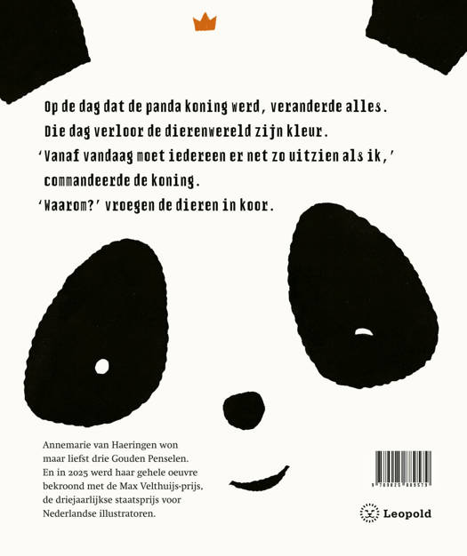 In het prentenboek De kleur van de panda van Max Velthuijs-winnares Annemarie van Haeringen veranderde alles op de dag dat de panda koning werd. ‘Vanaf vandaag moet iedereen er net zo uitzien als ik,’ commandeerde hij. ‘Waarom?’ vroegen de dieren. Maar ze trokken allemaal een zwart-wit pandakostuum aan en de koning droeg hun kleed, liefst zo bont en kleurig mogelijk. Tot hij de mandril-outfit probeerde. En het pak van de naaktslak: ‘Zo bloot, je ziet alles!’ Beschaamd kroop hij terug in zijn eigen vlekken. En de dieren haalden opgelucht adem, ze konden weer zijn wie ze waren.