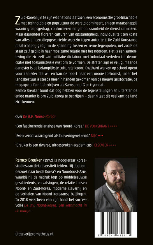 Zuid-Korea lijkt te zijn wat het ons laat zien: een economische grootmacht die met technologie en popcultuur de wereld domineert, en een maatschappij waarin groepsgedrag, conformeren en gehoorzaamheid de dienst uitmaken. Maar daaronder floreren culturen van opstandigheid en individualiteit ten koste van alles en een diepgewortelde weerzin tegen autoriteit. De Zuid-Koreaanse maatschappij gedijt in de spanning tussen extreme tegenpolen, net zoals de staat zelf gedijt in haar moeizame relatie met het noorden. Het is een samenleving die zichzelf van militaire dictatuur met koloniaal verleden tot democratie met toekomstvisie wist om te vormen. De straten zijn er veilig, maar de gangster is de belangrijkste culturele icoon. Knalhard werken op school opent voor eenieder die wil en kan de poort naar een mooie toekomst, maar het landsbestuur is steeds meer in handen gekomen van de nieuwe aristocratie, de megagrote familiebedrijven als Samsung, LG en Hyundai. Remco Breuker toont dat de enige manier om Zuid-Korea te begrijpen is om oog te hebben voor de tegenstellingen en uitersten – daarin laat dit veelkantige land zich kennen. Remco Breuker (1972) is hoogleraar Koreastudies aan de Universiteit Leiden. Hij doet onderzoek naar beide Korea’s en Noordoost-Azië, waarbij hij de nadruk legt op geschiedenis, de relatie tussen Noord- en Zuid-Korea, moderne slavernij en de verhalen van Noord-Koreaanse ballingen. In 2018 verscheen van zijn hand het succesvolle De B.V. Noord-Korea. Een kernmacht in de marge.