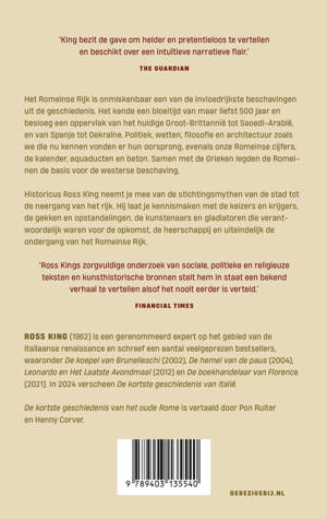 Historicus Ross King neemt je mee van de stichtingsmythes van de stad tot de neergang van het rijk. Hij laat je kennismaken met de keizers en krijgers, de gekken en opstandelingen, de kunstenaars en gladiatoren die verantwoordelijk waren voor de opkomst, de heerschappij – en uiteindelijk de ondergang van het Romeinse Rijk.