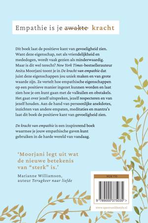 Dit boek laat de positieve kant van gevoeligheid zien. Want deze eigenschap, net als vriendelijkheid en mededogen, wordt vaak gezien als minderwaardig. Maar is dit wel terecht? New York Times-bestsellerauteur Anita Moorjani laat je in De kracht van empathie zien dat juist deze eigenschappen jou uniek maken en van grote waarde zijn. Ze vertelt hoe empathische eigenschappen op een positieve manier ingezet kunnen worden en laat zien hoe je om kunt gaan met de valkuilen en obstakels. Het gaat over jezelf uitspreken, jezelf respecteren en van jezelf houden. Aan de hand van persoonlijke anekdotes, inzichten van andere empaten, meditaties en mantra’s laat dit boek de positieve kant van gevoeligheid zien.