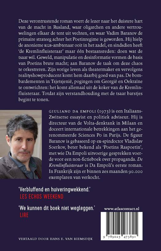 De Kremlinfluisteraar is een meeslepende roman die de lezer voert naar het duistere hart van de macht in Rusland. Oligarchen en andere vertrouwelingen vechten elkaar de tent uit, en Vadim Baranov is de strateeg achter het Poetinregime geworden. Hij hielp de destijds anonieme KGB-ambtenaar ooit in het zadel. Sindsdien heeft ‘de Kremlinfluisteraar’ maar één bestaansreden: doen wat de tsaar wil. Geweld, manipulatie en desinformatie vormen de basis van Poetins brute macht; aan Baranov de taak om deze chaos te orkestreren. Zijn vorige leven als theatermaker komt hem daarbij goed van pas. De bombardementen in Tsjetsjenië, pogingen om Georgië en Oekraïne te ontwrichten: het komt allemaal uit de koker van de Kremlinfluisteraar. Totdat zijn verstandhouding met de tsaar barstjes begint te tonen.