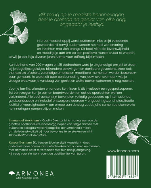 Aan de hand van 200 vragen en 25 opdrachten word je uitgenodigd om stil te staan bij je dagelijkse gelukjes, bijzondere belevingen en dankbare gevoelens. Maar ook thema's als afscheid, verdrietige emoties en moeilijkere momenten worden bespreekbaar gemaakt. Zo wordt dit boek een bundeling van jouw levensverhaal - wie je vroeger was, waar je vandaag van geniet en welke toekomstdromen je nog koestert.