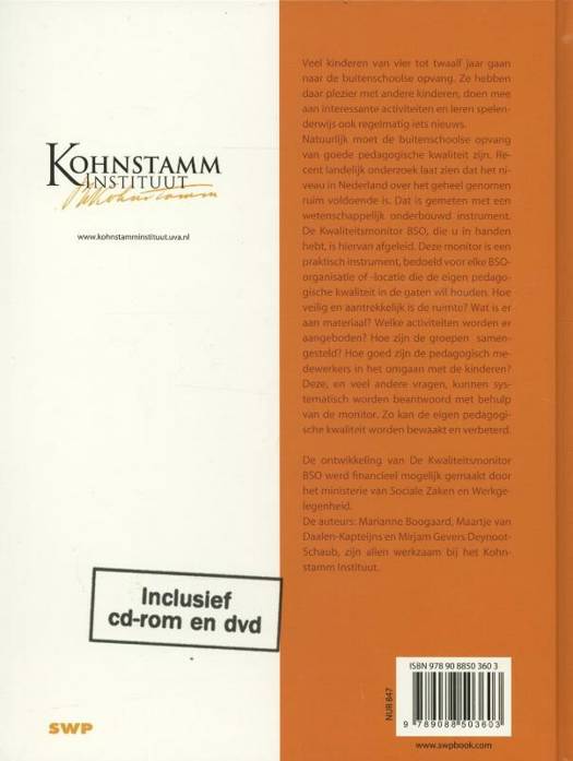 Goede kinderopvang biedt kinderen veiligheid en ontwikkelingskansen. Hoe kun je te weten komen of je deze veiligheid en ontwikkeling als kinderopvangorganisatie realiseert? Met de NCKO-Kwaliteitsmonitor voor kinderdagverblijven uit 2009 hebben kinderdagverblijven een instrument in handen om de kwaliteit zichtbaar te maken en te meten op een wijze die wetenschappelijk gevalideerd is. Met deze "Kwaliteitsmonitor BSO" is nu eenzelfde kwaliteitsmeting mogelijk voor de buitenschoolse opvang. Het model onderscheidt zes interactievaardigheden gericht op kinderen van 4 tot 13 jaar: emotionele ondersteuning, respect voor autonomie, regie en leiding, praten en uitleggen, ontwikkelingsstimulering en begeleiden van sociale interacties. Voorbeeldfragmenten van deze vaardigheden zijn te vinden op de dvd. Er is een checklist opgenomen voor de Observatielijst kwaliteit van de leefomgeving en bij de Groepsmeter voor sociale contacten hoort een cd-rom met instructie en een Excel-programma voor het uitvoeren van de berekeningen. De dvd en de cd-rom zijn achter in dit boek te vinden. Deze "Kwaliteitsmonitor BSO" is het instrument waarmee BSO-organisaties of -locaties zelf een beeld kunnen krijgen van de pedagogische kwaliteit van de opvang die zij bieden.