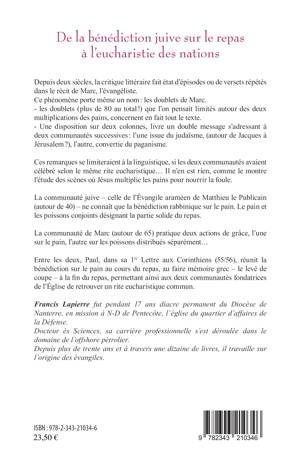 Depuis deux siècles, la critique littéraire fait état d'épisodes ou de versets répétés dans le récit de Marc, l'évangéliste. Ce sont les doublets de Marc. On les pensait limités autour des deux multiplications des pains, mais ils concernent en fait tout le texte. Une disposition sur deux colonnes livre un double message s'adressant à deux communautés successives : l'une issue du judaïsme, l'autre convertie du paganisme. Ces remarques se limiteraient à la linguistique, si les deux communautés avaient célébré le même rite. Il n'en est rien. Dans sa 1ère lettre aux Corinthiens, Paul permet aux deux communautés fondatrices de l'Église de retrouver un rite eucharistique commun.