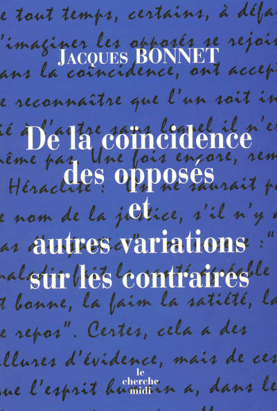 (la coïncidence des opposés) apparaît à travers les âges chez des auteurs aussi différents qu'Héraclite, Nicolas de Cuse, Giordano Bruno ou Jacques Derrida. Il consiste, pour le résumer simplement, à considérer qu'à un certain niveau d'approche les choses et leur contraire s'équivalent. Ainsi une toupie lancée à pleine vitesse semble immobile, le froid extrême donne une impression de chaleur, et pour certaines mystiques, la vie et la mort sont égales. Ou bien encore, en rhétorique, l'ironie permet de dire à la fois une chose et son contraire. Ce concept parcourt la culture occidentale depuis plus de vingt-cinq siècles, mais de manière souterraine, ou pour exprimer l'inexprimable de la mystique religieuse ou amoureuse.
