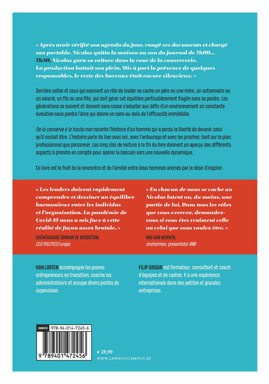 « Après avoir vérifié son agenda du jour, rangé ses documents et chargé son portable, Nicolas quitta la maison au son du journal de 7h00... 7h30. Nicolas gara sa voiture dans la cour de la conserverie. La production battait son plein. Mis à part la présence de quelques responsables, le reste des bureaux était encore silencieux. » Derrière celles et ceux qui exercent un rôle de leader se cache un père ou une mère, un actionnaire ou un salarié, un fils ou une fille, qui doit gérer cet équilibre particulièrement fragile sans se perdre. Les générations se suivent et doivent sans cesse s'adapter aux défis d'un environnement en évolution sans perdre l'âme qui donne un sens au-delà de l'efficacité immédiate. De la conserve à la haute mer raconte l'histoire d'un homme qui a perdu la liberté de devenir celui qu'il voulait être. L'histoire parle du lien avec soi, avec l'entourage et avec les proches, tant sur le plan professionnel que personnel. Les cinq clés de lecture à la fin du livre donnent un aperçu des différents aspects à prendre en compte pour opérer la bascule vers une nouvelle dynamique. Ce livre est le fruit de la rencontre et de l'amitié entre deux hommes animés par le désir d'inspirer.