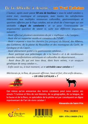L’auteur, après avoir passé 50 ans de bonheur « sous le soleil catalan », entre mer, montagne et campagne, avec toutes les satisfactions inhérentes aux multiples ressources culturelles, gastronomiques et sportives offertes par le Pays catalan, est en droit de s’interroger sur son véritable « degré de catalanité » et se pose l’intéressante (et angoissante) question de savoir si, suite aux différents arguments suivants : - Avoir effectué plusieurs ascensions du pic « mythique » du Canigou… - Avoir été un supporter assidu et convaincu de l’USAP… - Avoir « arpenté » tous les chemins (ou presque) du littoral, des Albères, des Corbières, de la plaine du Roussillon et des montagnes du Carlit, de Cerdagne et du Capcir… - Avoir pleinement goûté à la gastronomie catalane… - Avoir participé aux pèlerinages de « La Sanch » et à de nombreuses grandes manifestations artistiques et culturelles du département… - Avoir deux fils qui ont tous deux, dans leurs veines, « un soupçon génétique de sang catalan »… - Enfin avoir eu, à tout moment, un « véritable cœur catalan » !