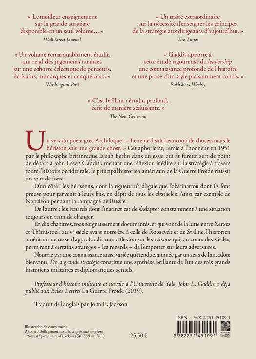 Un vers du poete grec Archiloque: Le renard sait beaucoup de choses, mais le herisson sait une grande chose. Cet aphorisme, remis a l'honneur en 1951 par le philosophe britannique Isaiah Berlin dans un essai qui fit fureur, sert de point de depart a John Lewis Gaddis: menant une reflexion inedite sur la strategie a travers toute l'histoire occidentale, le principal historien americain de la Guerre Froide reussit un tour de force. D'un cote: les herissons, dont la rigueur n'a d'egale que l'obstination dont ils font preuve pour parvenir a leurs fins, en depit de tous les obstacles. Ainsi par exemple de Napoleon pendant la campagne de Russie. De l'autre: les renards dont l'instinct est de s'adapter constamment a une situation toujours en train de changer. En dix chapitres, tous soigneusement documentes, et qui vont de la lutte entre Xerxes et Themistocle au Ve siecle avant notre ere a celle de Roosevelt et de Staline, l'historien americain ne cesse d'approfondir une reflexion sur les raisons qui, au cours des siecles, permirent a certains strateges - les renards - de l'emporter sur leurs adversaires. Nourrie par une connaissance aussi variee qu'etendue, animee par un sens de l'anecdote bienvenu, De la grande strategie constitue une synthese brillante de l'un des tres grands historiens militaires et diplomatiques actuels.