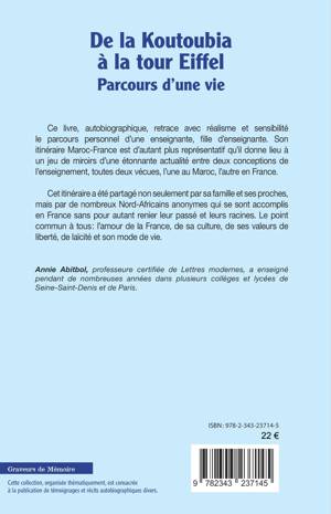 Ce livre, autobiographique, retrace avec réalisme et sensibilité le parcours personnel d'une enseignante, fille d'enseignante. Son itinéraire Maroc-France est d'autant plus représentatif qu'il donne lieu à un jeu de miroirs d'une étonnante actualité entre deux conceptions de l'enseignement, toutes deux vécues, l'une au Maroc, l'autre en France. Cet itinéraire a été partagé non seulement par sa famille et ses proches, mais par de nombreux Nord-Africains anonymes qui se sont accomplis en France sans pour autant renier leur passé et leurs racines. Le point commun à tous: l'amour de la France, de sa culture, de ses valeurs de liberté, de laïcité et son mode de vie.