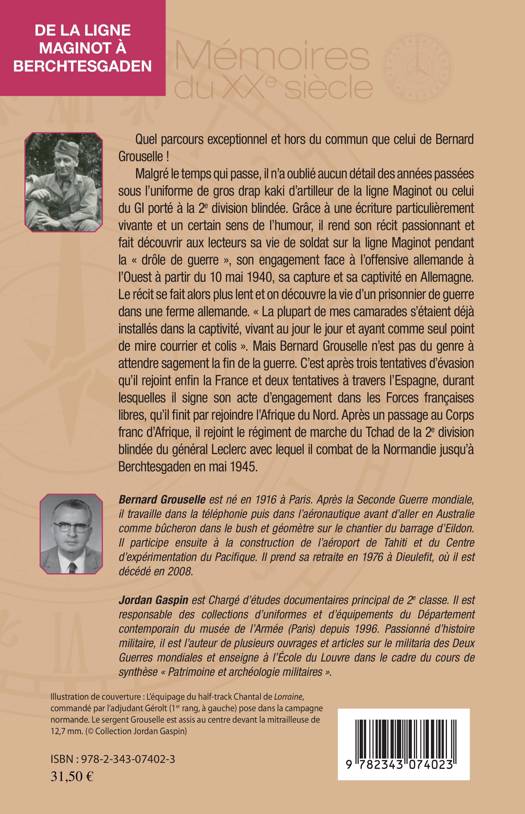 Quel parcours hors du commun que celui de Bernard Grouselle ! Grâce à une écriture vivante, il nous fait découvrir avec humour sa vie de soldat sur la ligne Maginot pendant la « drôle de guerre », son engagement face à l’offensive allemande à l’Ouest, sa capture et sa captivité dans une ferme. Il raconte ensuite sa fuite et son enrôlement dans les Forces françaises libres en Afrique aux côtés du général Leclerc. Il combattra avec lui de la Normandie jusqu’à Berchtesgaden en mai 1945.