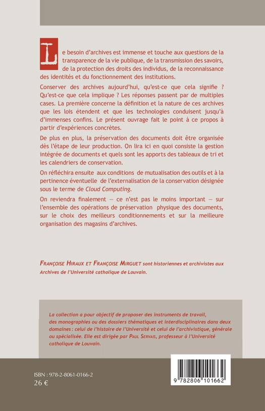 L’ouvrage commence par la définition et la nature des archives en pleine révolution. Il se poursuit par une présentation de la gestion intégrée de documents et fournit des pistes d’évaluation. On réfléchira aux conditions de mutualisation des outils et à la pertinence éventuelle de l’externalisation de la conservation. On reviendra sur l’ensemble des opérations de préservation physique des documents, le choix des meilleurs conditionnements et la meilleure organisation des magasins d’archives.