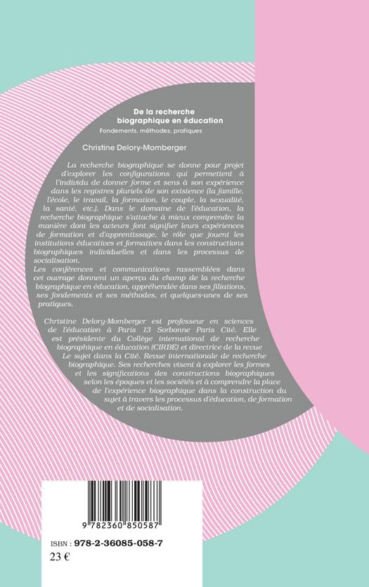 Le recherche biographique se donne pour projet d'explorer les configurations qui permettent à l'individu de donner forme et sens à son expérience dans les registres pluriels de son existence. Dans le domaine de l'éducation, elle s'attache à mieux comprendre la manière dont les acteurs font signifier leurs expériences de formation et d'apprentissage, le rôle que jouent les institutions éducatives et formatives dans les constructions biographiques individuelles et dans les processus de socialisation.