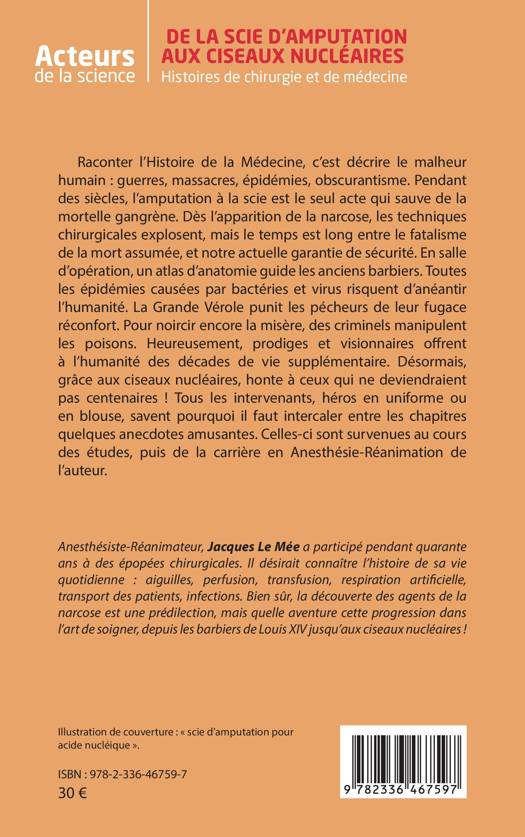 Raconter l'Histoire de la Médecine, c'est décrire le malheur humain: guerres, massacres, épidémies, obscurantisme. Pendant des siècles, l'amputation à la scie est le seul acte qui sauve de la mortelle gangrène. Dès l'apparition de la narcose, les techniques chirurgicales explosent, mais le temps est long entre le fatalisme de la mort assumée, et notre actuelle garantie de sécurité. En salle d'opération, un atlas d'anatomie guide les anciens barbiers. Toutes les épidémies causées par bactéries et virus risquent d'anéantir l'humanité. La Grande Vérole punit les pécheurs de leur fugace réconfort. Pour noircir encore la misère, des criminels manipulent les poisons. Heureusement, prodiges et visionnaires offrent à l'humanité des décades de vie supplémentaire. Désormais, grâce aux ciseaux nucléaires, honte à ceux qui ne deviendraient pas centenaires ! Tous les intervenants, héros en uniforme ou en blouse, savent pourquoi il faut intercaler entre les chapitres quelques anecdotes amusantes. Celles-ci sont survenues au cours des études, puis de la carrière en Anesthésie-Réanimation de l'auteur.