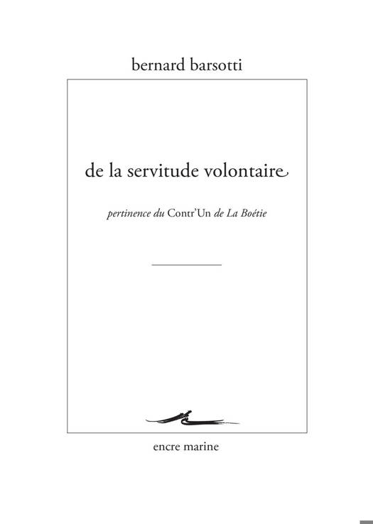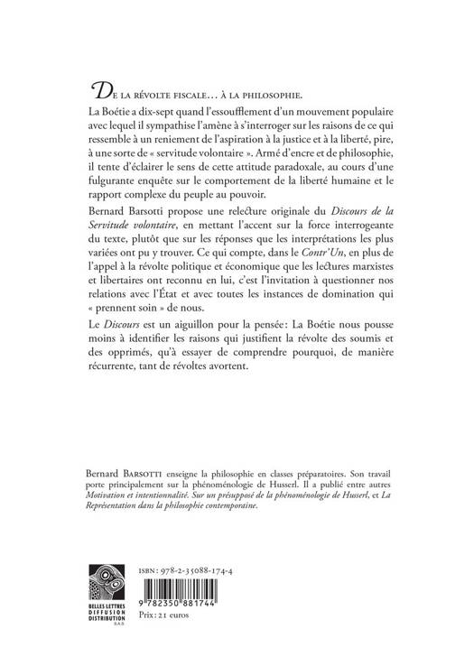 La Boetie a dix-sept quand l'essoufflement d'un mouvement populaire avec lequel il sympathise l'amene a s'interroger sur les raisons de ce qui ressemble a un reniement de l'aspiration a la justice et a la liberte, pire, a une sorte de " servitude volontaire ". Arme d'encre et de philosophie, il tente d'eclairer le sens de cette attitude paradoxale, au cours d'une fulgurante enquete sur le comportement de la liberte humaine et le rapport complexe du peuple au pouvoir. Bernard Barsotti propose une relecture originale du Discours de la Servitude volontaire, en mettant l'accent sur la force interrogeante du texte, plutot que sur les reponses que les interpretations les plus variees ont pu y trouver. Ce qui compte, dans le Contr'Un, en plus de l'appel a la revolte politique et economique que les lectures marxistes et libertaires ont reconnu en lui, c'est l'invitation a questionner nos relations avec l'Etat et avec toutes les instances de domination qui " prennent soin " de nous. Le Discours est un aiguillon pour la pensee: La Boetie nous pousse moins a identifier les raisons qui justifient la revolte des soumis et des opprimes, qu'a essayer de comprendre pourquoi, de maniere recurrente, tant de revoltes avortent.