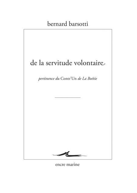 De la révolte fiscale… à la philosophie. La Boétie a dix-sept quand l’essoufflement d’un mouvement populaire avec lequel il sympathise l’amène à s’interroger sur les raisons de ce qui ressemble à un reniement de l’aspiration à la justice et à la liberté, pire, à une sorte de « servitude volontaire ». Armé d’encre et de philosophie, il tente d’éclairer le sens de cette attitude paradoxale, au cours d’une fulgurante enquête sur le comportement de la liberté humaine et le rapport complexe du peuple au pouvoir. Bernard Barsotti propose une relecture originale du Discours de la Servitude volontaire, en mettant l’accent sur la force interrogeante du texte, plutôt que sur les réponses que les interprétations les plus variées ont pu y trouver. Ce qui compte, dans le Contr’Un, en plus de l’appel à la révolte politique et économique que les lectures marxistes et libertaires ont reconnu en lui, c’est l’invitation à questionner nos relations avec l’État et avec toutes les instances de domination qui « prennent soin » de nous. Le Discours est un aiguillon pour la pensée : La Boétie nous pousse moins à identifier les raisons qui justifient la révolte des soumis et des opprimés, qu’à essayer de comprendre pourquoi, de manière récurrente, tant de révoltes avortent.