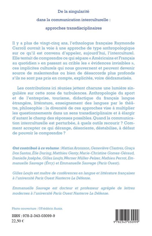 Qu'appelle-t-on l'interculturel ? Anthropologie du sport et de l'entreprise, tourisme, didactique du français langue étrangère, littérature, enseignement des langues par le théâtre, philosophie : la diversité de ces approches vise à multiplier les questionnements dans un sens transdisciplinaire et à élargir d'autant le champ des réponses possibles. Quand la communication interculturelle est perturbée, à quels outils recourir ? Comment accepter ce qui dérange, désoriente, déstabilise, à défaut de pouvoir le comprendre ?