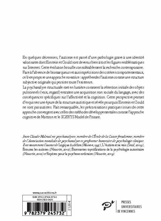 La psychanalyse structurale met en lumière comment la rétention initiale des objets pulsionnels (voix, regard) entraîne une acquisition non sociale du langage, avec des conséquences spécifiques sur l’affectivité et la cognition. Cette perspective permet d’esquisser une épure de la structure autistique et révèle pourquoi Einstein et Gould ne sont pas autistes. Fait remarquable, les préconisations pratiques issues de cette approche convergent avec celles des méthodes développementales comme l’approche cognitive de Mottron et le SCERTS Model de Prizant.