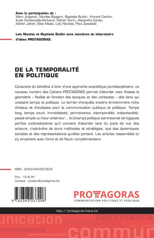 Conscient du bénéfice à tirer d'une approche scientifique pluridisciplinaire, ce nouveau numéro des Cahiers PROTAGORAS permet d'aborder avec finesse la géométrie - flexible en fonction des époques et des contextes - des liens qui unissent temps et politique. Le terrain d'enquête s'avère éminemment riche d'enjeux et d'analyses pour la communication publique et politique. Temps long, temps court, immédiateté, permanence, intemporalité, instantanéité, passé simple ou futur antérieur... le (champ) politique est traversé de logiques parfois contradictoires qu'il convient d'aborder tant du point de vue des acteurs, c'est-à-dire de leurs méthodes et stratégies, que des dynamiques sociales et des représentations qu'elles portent. Les articles rassemblés ici s'y emploient avec force et de façon complémentaire.