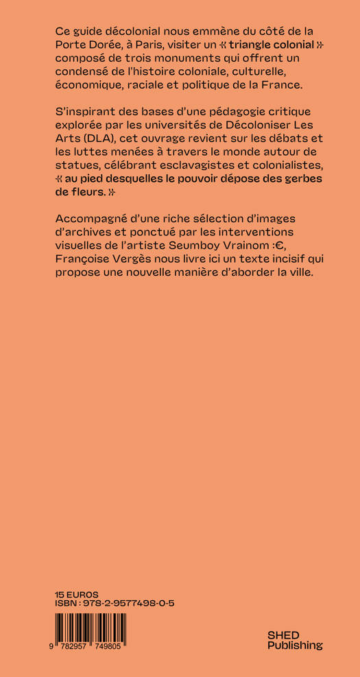 Ce guide décolonial nous emmène à l'est de Paris visiter un véritable « triangle colonial », composé de trois monuments qui offrent un condensé de l'histoire culturelle, économique, raciale et politique de la France. On y croisera une colossale fresque mettant en scène le travail forcé dans les colonies, un monument qui fait régulièrement l'objet d'actions anti-colonialistes, et une statue d'Athéna représentant « La France apportant la paix et la prospérité aux colonies ». Posant les bases d'une pédagogie critique explorée par le collectif Décoloniser Les Arts (DLA), cet ouvrage revient sur les débats et les luttes menées à travers le monde autour de statues, célébrant esclavagistes et colonialistes, « au pied desquelles le pouvoir dépose des gerbes de fleurs. » Accompagné d'une riche sélection d'images d'archives et ponctué par les interventions visuelles de l'artiste Seumboy Vrainom :?, Françoise Vergès nous livre ici un texte incisif qui propose une nouvelle manière d'aborder la