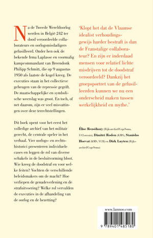 Na de Tweede Wereldoorlog werden in België 242 ter dood veroordeelde collaborateurs en oorlogsmisdadigers gefusilleerd. Onder hen ook de bekende Irma Laplasse en voormalig kampcommandant van Breendonk Philipp Schmitt, die op 9 augustus 1950 als laatste de kogel kreeg. De executies staan in het collectieve geheugen van de repressie gegrift. De maatschappelijke en symbolische weerslag was groot. En toch, of net daarom, zijn er veel misvattingen over deze terechtstellingen. Dit boek opent voor het eerst het volledige archief van het militair gerecht, de centrale speler in het verhaal. Vier oorlogs- en rechtshistorici presenteren individuele cases en leggen de rol van diverse schakels in de besluitvorming bloot. Wie kreeg de doodstraf en voor welke feiten? Vochten de verschillende beleidsmakers om de macht? Hoe verliepen de genadeverlening en de strafuitvoering? Welke rol vervulden de executies in de afhandeling van de oorlog en de bezetting? 'Klopt het dat de Vlaamse idealist verhoudingsgewijs harder bestraft is dan de Franstalige collaborateur? En zijn er inderdaad mensen voor relatief lichte misdrijven tot de doodstraf veroordeeld? Dankzij het groepsportret van de gefusilleerden kunnen we nu een onderscheid maken tussen werkelijkheid en mythe.'