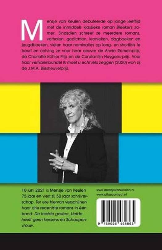 ‘De laatste gasten’, ‘Liefde heeft geen hersens’ en ‘Schoppenvrouw’, de drie recentste romans van Mensje van Keulen, verschijnen in één band ter ere van haar 75e verjaardag en haar 50 jaar schrijverschap. ‘De laatste gasten’ gaat over Florrie die, als haar tante overlijdt, het huis moet verlaten en werk vindt in d’Meihof, een landhuis aan de Amstel. Met haar komst veranderen de onderlinge verhoudingen tussen de gasten. Het is een prachtig, beheerst geschreven drama over wantrouwen en stond op de longlist van de AKO Literatuurprijs. In ‘Liefde heeft geen hersens’ vermoedt Romy dat haar zoon is betrokken bij de roofoverval op haar bejaarde buurvrouw. Deze schitterende roman over de vele facetten van liefde stond op de shortlist van de AKO Literatuurprijs, de longlist van de Libris Literatuur Prijs en de shortlist van de Opzij Literatuurprijs. ‘Schoppenvrouw’ gaat over Paula die haar eigen kind in de daderbeschrijving van een ‘Opsporing Verzocht’-bericht herkent, en terugdenkt aan een schokkende episode uit haar eigen jeugd. Volgens ‘De Limburger’ is dit een roman van ‘zwartfluwelen perfectie’, hij stond op de longlist van de ECI Literatuurprijs en de longlist van de Fintro Literatuurprijs.