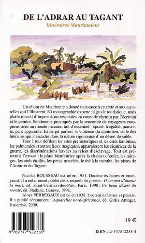 Ni monographie experte ni guide touristique, cet ouvrage est plutôt un recueil d'impressions ressenties lors d'un séjour en Mauritanie par l'écrivain et le peintre. Tout à tour défilent les sites préhistoriques et les cités fantômes, les palmeraies et autres lieux magiques, apparaissent les cicatrices de la guerre, les discriminations larvées au relent d'esclavage. Tout est prétexte à l'extase : la pluie bienfaitrice après la chaleur d'enfer, les mirages, les ciels étoilés, les petits marchés, le thé à la menthe, les pistes de l'Adrar et du Tagant.