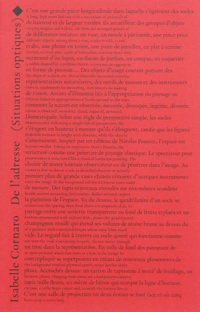 In this artist book Cornaro investigates how we appropriate and domesticate nature by perpetual deconstruction and reconstruction. Particularly interested in the transitions from 3 to 2 dimensions, Cornaro creates 'graphic' works with media such as film, sculpture and photography, revealing the workings of our imagination of the world. Text by Julie Pellegrin