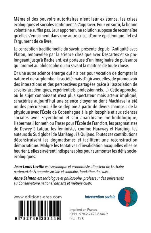Or une autre science émerge qui n'a pas pour vocation de dompter la nature et de surplomber la société mais d'agir avec elles, de promouvoir des interactions et des perspectives partagées grâce à l'association de savoirs (académiques, expérientiels, professionnels...). Cette approche, où le sujet connaissant n'est plus spectateur mais acteur impliqué, caractérise aujourd'hui une science citoyenne dont Machiavel a été un des précurseurs. Elle se déploie à partir de divers champs : de la physique avec l'École de Copenhague à la philosophie et aux sciences sociales avec Feyerabend et son anarchisme méthodologique, Habermas, Honneth ou Fraser pour l'École de Francfort, les pragmatistes de Dewey à Latour, les féministes comme Haraway et Harding, les auteurs du Sud global de Mariàtegui à Quijano. Toutes ces contributions déconstruisent les dogmatismes et facilitent une reconstruction démocratique. Malgré les tentatives d'invalidation auxquelles elles se heurtent, elles s'avèrent indispensables pour surmonter les défis socio-écologiques.