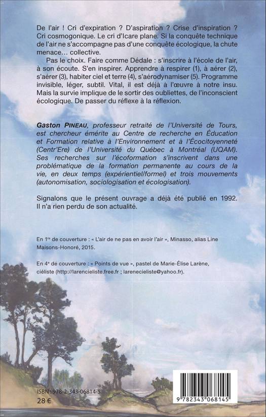 De l'air ! Cri d'expiration ? D'aspiration ? Crise d'inspiration ? Cri cosmogonique. Le cri d'Icare plane. Si la conquête technique de l'air ne s'accompagne pas d'une conquête écologique, la chute menace... collective. Pas le choix. Faire comme Dédale : s'inscrire à l'école de l'air, à son écoute. S'en inspirer. Apprendre à respirer, à aérer, s'aérer, habiter ciel et terre, s'aérodynamiser. Programme invisible, léger, subtil. Vital, il est déjà à l'oeuvre à notre insu. Cet ouvrage a déjà été publié en 1992. Il n'a rien perdu de son actualité.