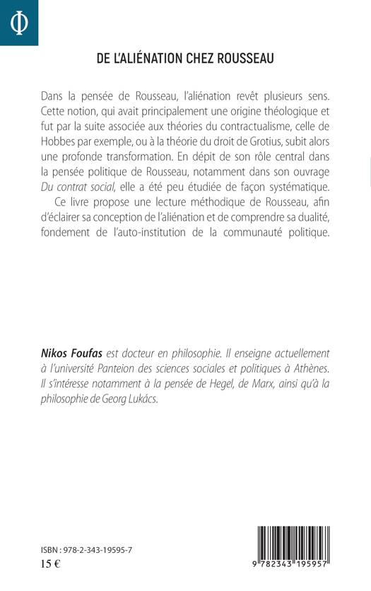 Dans la pensée de Rousseau, l'aliénation revêt plusieurs sens. Cette notion, qui avait principalement une origine théologique et fut par la suite associée aux théories du contractualisme, celle de Hobbes par exemple, ou à la théorie du droit de Grotius, subit alors une profonde transformation. En dépit de son rôle central dans la pensée politique de Rousseau, elle a été peu étudiée de façon systématique. Cet ouvrage propose une lecture méthodique de Rousseau, afin d'éclairer sa conception de l'aliénation et de comprendre sa dualité, fondement de l'auto-institution de la communauté politique.