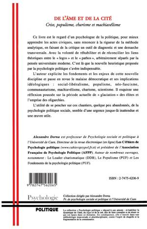 Ce livre est le regard d'un psychologue de la politique, pour mieux apprendre les actes civiques, sans renoncer à la rigueur de la méthode analytique, en faisant de la critique un outil de diagnostic et une démarche transversale. L'auteur explicite les fondements et les enjeux de cette nouvelle discipline et passe en revue le malaise démocratique et ses implications idéologiques : social-libéralisme, populisme, néo-fascisme, communautarisme, machiavélisme, charisme, scientisme. il esquisse une réflexion sur les élites et l'emprise des oligarchies.