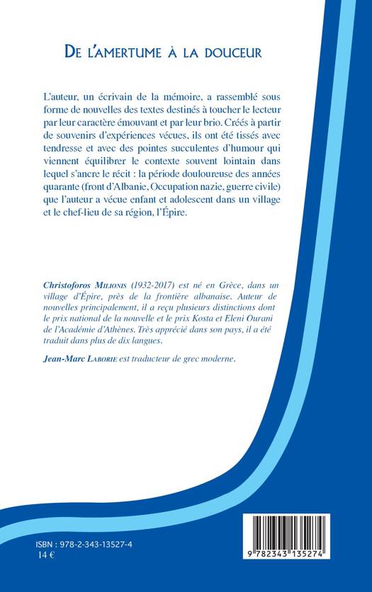 L'auteur, un écrivain de la mémoire, a rassemblé sous forme de nouvelles des textes destinés à toucher le lecteur par leur caractère émouvant et par leur brio.Elles ont été tissées avec tendresse et des pointes d'humour dans le contexte douloureux des années quarante (front d'Albanie, Occupation nazie, guerre civile) que l'auteur a vécue enfant et adolescent dans un village et le chef-lieu de sa région, l'Épire.