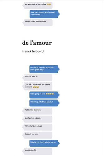 de l'amour se compose de quatre scènes, quatre échelles autonomes : un salon de discussions en ligne, des échanges sur l'application tinder, une scène de sexe, une correspondance amoureuse à plusieurs mains, sur plusieurs pays, le passage d'une scène et d'une échelle à l'autre permet au lecteur de zoomer puis dézoomer, d'aller au plus fin, au plus intime, le lecteur n'aura toutefois jamais accès à ce que les anglo-saxons appellent la big picture - car cette dernière n'existe pas : il n'y a pas de position panoramique, il n y a que des dispositifs socio-techniques (un chat sur internet, une application sur smartphone, une sex-tape amateure, des spams échangés par email), les suivre simplement en lisant ce qu'ils racontent dessine le portrait d'une génération qui réinvente les codes de l'écriture et de la rencontre amoureuse.