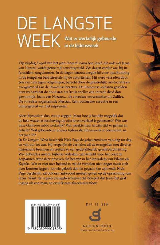 'Op vrijdag 3 april van het jaar 33 werd Jozua ben Jozef, die ook wel Jezus van Nazaret wordt genoemd, terechtgesteld. Zes dagen eerder was hij in Jeruzalem aangekomen. In de dagen daarna zorgde hij voor opschudding in de tempel en bekritiseerde hij de autoriteiten. Hij werd verraden door één van zijn eigen volgelingen, berecht door de plaatselijke aristocratie en overgeleverd aan de Romeinse bezetter. De Romeinse soldaten geselden hem zo hard dat de dood aan het kruis sneller zijn intrede deed dan gewoonlijk. Jezus van Nazaret... de zoveelste onruststoker uit Galilea. De zoveelste zogenaamde Messias. Een routineuze executie in een buitengebied van het imperium.' Niets bijzonders dus, zou je zeggen. Maar hoe is het dán mogelijk dat de hele westerse beschaving op zijn levensverhaal is gebaseerd? Wie was deze Galileese rabbi werkelijk? Wat maakte hem in zijn tijd zo gehaat én geliefd? Wat gebeurde er precies tijdens de lijdensweek in Jeruzalem, in het jaar 33? In De Langste Week beschrijft Nick Page de gebeurtenissen van dag tot dag en van uur tot uur. Hij vergelijkt de verhalen uit de evangeliën met diverse historische bronnen en creëert zo een gedetailleerde geschiedschrijving. Wie bekend is met de bijbelse verhalen, zal wellicht voor het eerst de gespannen atmosfeer proeven die heerste in het Jeruzalem van Pilatus en Kajafas. Wie er niet mee bekend is, zal de verhalen niet langer naast zich neer kunnen leggen. En wie gelooft dat het gegaan kan zijn zoals Nick Page beschrijft , zal ook een antwoord moeten geven op de opstanding van Jezus. Want: 'er is geen evangelieschrijver die beweert dat Jezus het graf inging als een man, en eruit kwam als een metafoor'.