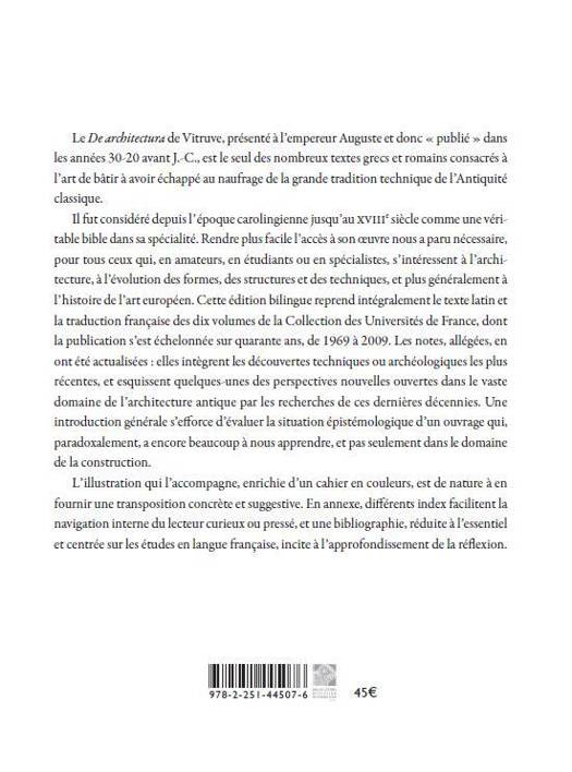 English summary: Vitruvius's De architectura remained the most essential of architectural treatises from the first to the eighteenth century. This Latin edition and French translation, richly illustrated, allows readers to discover the sole surviving classical text on the subject. French description: Le Traite d'architecture de Vitruve, presente a l'empereur Auguste et donc publie dans les annees 30-20 av. J.-C., est le seul des textes grecs et romains consacres a l'art de batir, dont nous savons qu'ils furent nombreux, a avoir echappe au naufrage de la grande tradition technique de l'Antiquite classique. Considere depuis l'epoque carolingienne jusqu'au XVIIIe siecle comme une veritable bible dans sa specialite, il souffre aujourd'hui d'un relatif discredit, et rares sont les praticiens contemporains qui jugent utile de le relire, ou meme seulement de le feuilleter. Le but de la presente edition n'est pas de rehabiliter le vieux theoricien, et encore moins d'en promouvoir de nouveau l'usage a des fins theoriques ou pratiques: ce serait, a l'age de la conception assistee par ordinateur, ou l'accent est mis sur la rationalite des programmes, l'industrialisation des techniques et la purete des formes serielles, pour le moins incongru. Mais rendre plus facile l'acces a son oeuvre nous a paru neanmoins necessaire, pour tous ceux qui, en amateurs, en etudiants ou en specialistes, s'interessent a l'architecture, a l'evolution des formes, des structures et des techniques, et plus generalement a l'histoire de l'art europeen. Pour cela, nous avons evidemment conserve l'integralite du texte original et de sa traduction, mais singulierement reduit les commentaires qui dans la grande edition des Belles Lettres en accompagnaient presque chaque mot, ou du moins chaque notion, et supprime ce qu'on appelle l'apparat critique, c'est-a-dire la liste des variantes reperees dans les manuscrits medievaux du De architectura. Sous une forme maniable, et sans rien perdre d'essentiel, cette nouvelle version, qui integre les decouvertes archeologiques les plus recentes, autorise la consultation continue ou anthologique d'un ouvrage qui demeure, en l'etat de notre documentation, unique en son genre, et qui, paradoxalement, a encore beaucoup a nous apprendre, et pas seulement dans le domaine de la construction. L'illustration qui l'accompagne, enrichie d'un cahier en couleurs, est de nature a en fournir une transposition concrete et suggestive. En annexe, differents index facilitent la navigation interne du lecteur curieux ou presse, et une bibliographie, reduite a l'essentiel et centree sur les etudes en langue francaise, incite a l'approfondissement de la reflexion. En cette annee de la celebration du bimillenaire de la mort d'Auguste, il ne nous a pas paru inopportun de reactualiser l'un des ouvrages qui ont sur le long terme le plus durablement contribue a definir la culture specifique des premieres decennies de l'Empire romain. Rappelons les noms des editeurs des dix livres de ce Traite. Il est clair que le present volume leur doit tout, et d'abord sa substance meme, c'est-a-dire le corps de son texte, qu'ils ont etabli, traduit et explique: Livre I, Philippe Fleury, 1990; Livre II, Louis Callebat, Pierre Gros, Catherine Jacquemard, 1999; Livre III, Pierre Gros, 1990; Livre IV, Pierre Gros, 1992; Livre V, Catherine Saliou, 2009; Livre VI, Louis Callebat, 2004; Livre VII, Bernard Liou, Marie-Therese Cam, Michel Zuinghedau, 1885; Livre VIII, Louis Callebat, 1973; Livre IX, Jean Soubiran, 1969; Livre X, Louis Callebat, Philippe Fleury, 1986. Pierre Gros, Membre de l'Institut.