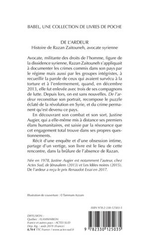 Avocate, militante des droits de l'homme, figure de la dissidence syrienne, Razan Zaitouneh s'appliquait à documenter les crimes commis dans son pays par le régime mais aussi par les groupes intégristes, à recueillir la parole de ceux qui avaient survécu à la torture et à l'enfermement, quand, en décembre 2013, elle fut enlevée avec trois de ses compagnons de lutte. Depuis lors, on est sans nouvelles. «De l'ardeur» reconstitue son portrait, recompose le puzzle éclaté de la révolution en Syrie, et du crime permanent qu'est devenu ce pays.