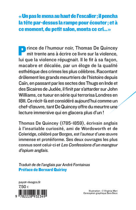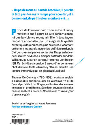 Prince de l'humour noir, Thomas De Quincey mit trente ans à écrire ce livre sur la violence, lui que la violence répugnait. Il le fit à sa façon, macabre et décalée, par un éloge de la qualité esthétique des crimes les plus célèbres. Racontant drôlement les grands meurtriers de l'histoire depuis Caïn, en passant par les sectes des Thugs en Inde et des Sicaires de Judée, il finit par s'attarder sur John Williams, ce tueur en série qui terrorisa Londres en 1811. Ce récit-là est considéré aujourd'hui comme un chef- d'oeuvre, tant De Quincey offre du meurtre une lecture immersive qui en glacera plus d'un !