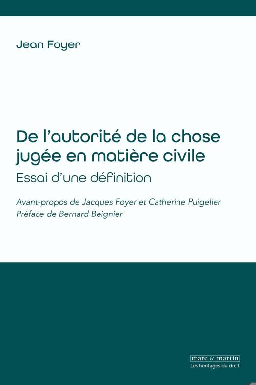 La thèse de Jean Foyer remet en cause la doctrine relative à l'autorité de la chose jugée en matière civile de la première moitié du XXe siècle en invoquant des confusions ou méprises. L'auteur décrit ces failles avec élégance et méthode (l'histoire du droit est ici subtilement explorée) – il suggère une erreur entre l'effet positif et l'effet substantiel du jugement. Il affirme plus simplement que l'autorité « de la chose jugée se fonde [..] sur une nécessité sociale. Nul besoin n'est d'aller en rechercher ailleurs la signification et le fondement ». Le propos (de bon sens) rejoignant les observations de Montesquieu selon lesquelles « Le repos des familles et de la société tout entière se fonde [….] sur ce qui est fini » est au moment de la rédaction de la thèse profondément novateur et à l'origine d'un mouvement positiviste et doctrinal essentiel.