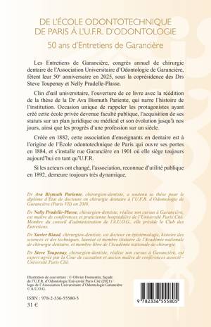 Les Entretiens de Garancière, congrès annuel de chirurgie dentaire de l'Association Universitaire d'Odontologie de Garancière, fête son 50e anniversaire en 2025, sous la coprésidence des Drs Steve Toupenay et Nelly Pradelle-Plasse. Clin d'oeil universitaire, l'ouverture de ce livre avec la réédition de la thèse de la Dr Ava Bismuth Pariente, qui narre l'histoire de l'institution. Occasion unique de rappeler les protagonistes ayant créé cette école privée devenue faculté publique, l'acquisition de ses statuts sur un plan juridique ou médical et son évolution jusqu'à nos jours, ainsi que les progrès d'une profession sur un siècle. Créée en 1882, cette association d'enseignants en dentaire est à l'origine de l'École odontotechnique de Paris qui ouvre ses portes en 1884, et s'installe rue Garancière en 1901 où elle siège toujours aujourd'hui en tant qu'U.F.R. Si les acteurs ont changé, l'association, reconnue d'utilité publique en 1892, demeure toujours très dynamique.