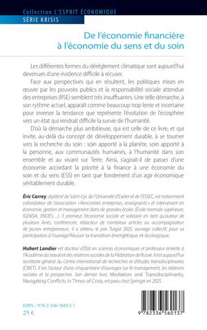 Les différentes formes du dérèglement climatique sont aujourd'hui devenues d'une évidence difficile à récuser. Face aux perspectives qui en résultent, les politiques mises en oeuvre par les pouvoirs publics et la responsabilité sociale attendue des entreprises (RSE) semblent très insuffisantes. Une telle démarche, à son rythme actuel, apparaît comme beaucoup trop lente et incertaine pour inverser la tendance que représente l'évolution de l'écosphère vers un état qui rendrait difficile la survie de l'humanité. D'où la démarche plus ambitieuse, qui est celle de ce livre, et qui invite, au-delà du concept de développement durable, à se tourner vers la recherche du soin soin apporté à la planète, soin apporté à la personne, aux communautés humaines, à l'humanité dans son ensemble et au vivant sur Terre. Ainsi, s'agirait-il de passer d'une économie accordant la priorité à la finance à une économie du soin et du sens (ESS) en tant que fondement d'un agir économique véritablement durable.
