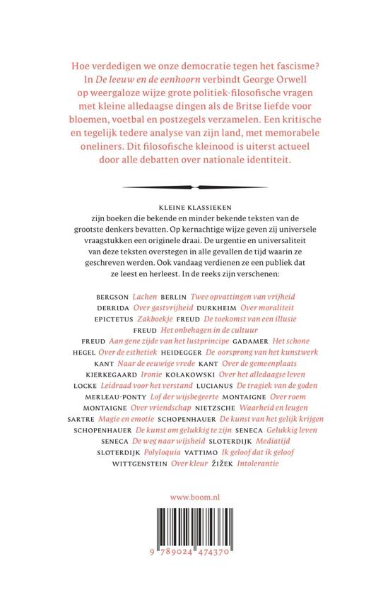 In De leeuw en de eenhoorn verbindt Orwell op weergaloze wijze grote politiek-filosofische vragen met kleine alledaagse dingen als de Britse liefde voor bloemen, voetbal en postzegels verzamelen. Een kritische en tegelijk tedere analyse van zijn land, met memorabele oneliners. Dit filosofische kleinood is uiterst actueel door alle debatten over nationale identiteit.