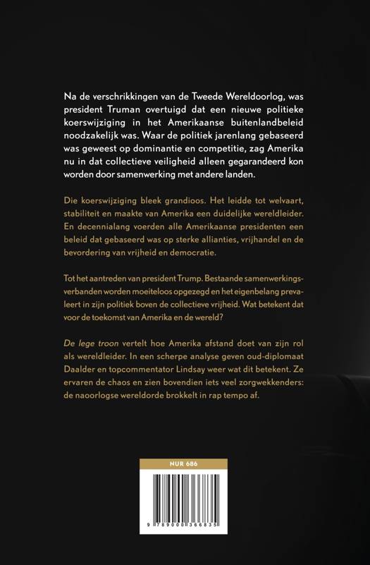 De lege troon vertelt hoe Amerika afstand neemt van zijn rol als wereldleider. In een scherpe analyse geven ouddiplomaat Daalder en topcommentator Lindsay weer wat dit betekent. Ze ervaren de chaos en zien bovendien iets veel zorgwekkenders: de naoorlogse wereldorde brokkelt in rap tempo af.