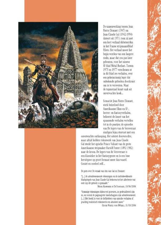 Scenarist Jean Pierre Dionnet, sterk beïnvloed door Amerikaanse films en SF-, horror- en fantasyverhalen, beheerst de kunst van het spannende verhalen vertellen tot in de puntjes; de episodes van De legers van de Veroveraar eindigen bijna steevast met een onverwachte ontknoping. Het uiterst doorwrochte, maar altijd heldere tekenwerk van Jean-Claude Gal steekt het epische Prince Valiant van de grote Amerikaanse stripmaker Harold Foster (1892-1982) naar de kroon. De legers van de Veroveraar is een klassieker in het fantasygenre en is een luxe heruitgave op groot formaat meer dan waard.