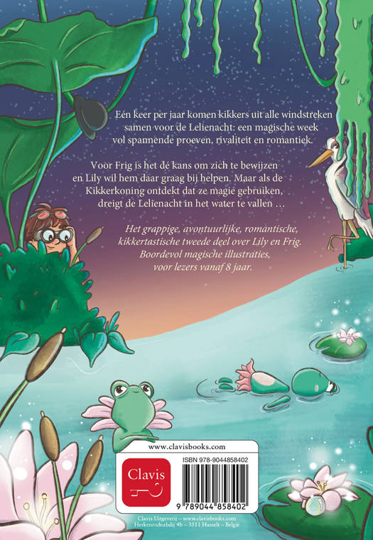 Eén keer per jaar komen kikkers uit alle windstreken samen voor de Lelienacht: een magische week vol spannende proeven, rivaliteit en romantiek. Voor Frig is het dé kans om zich te bewijzen en Lily wil hem daar graag bij helpen. Maar als de Kikkerkoning ontdekt dat ze magie gebruiken, dreigt de Lelienacht in het water te vallen … Het grappige, avontuurlijke, romantische, kikkertastische tweede deel over Lily en Frig. Boordevol magische illustraties, voor lezers vanaf 8 jaar.