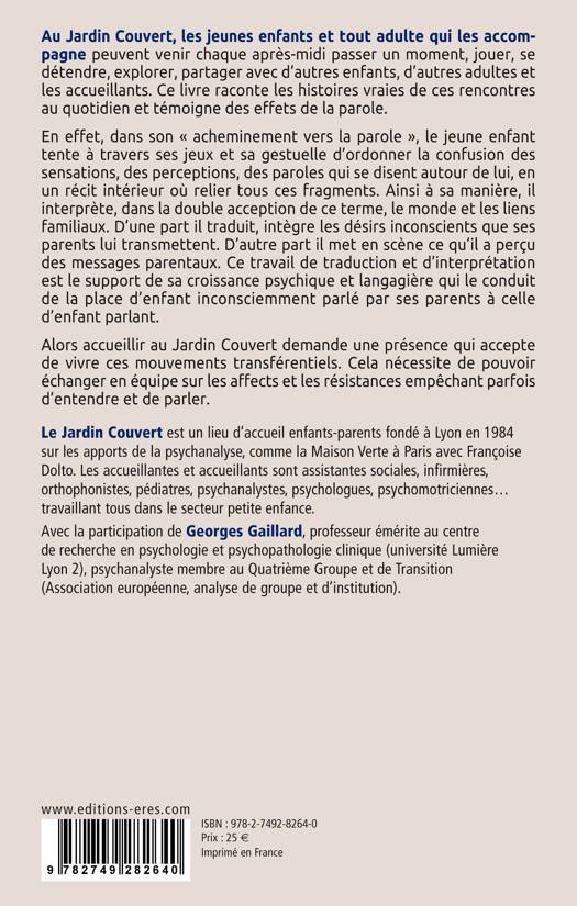 Au Jardin Couvert, chaque après-midi, les enfants, de leur naissance à leurs quatre ans, et tout adulte qui les accompagne peuvent venir passer un moment, jouer, se détendre, explorer, partager avec d’autres enfants, d’autres adultes et les accueillants. Ce livre raconte les histoires vraies de ces rencontres au quotidien et témoigne des effets de la parole. En effet, dans son « acheminement vers la parole », le jeune enfant tente, à travers ses jeux et sa gestuelle, d’ordonner la confusion des sensations, des perceptions, des paroles qui se disent autour de lui, en un récit intérieur où relier tous ces fragments. Ainsi à sa manière, il interprète, dans la double acception de ce terme, le monde et les liens familiaux. D’une part il traduit, intègre les désirs inconscients que ses parents lui transmettent. D’autre part il met en scène ce qu’il a perçu des messages parentaux. Ce travail de traduction et d’interprétation est le support de sa croissance psychique et langagière qui le conduit de la place d’enfant inconsciemment parlé par ses parents à celle d’enfant parlant. Alors accueillir au Jadin couvert demande une présence qui accepte de vivre ces mouvements transférentiels. Cela nécessite de pouvoir échanger en équipe sur les affects et les résistances qui empêchent parfois d’entendre et de parler.