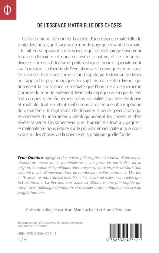 Ce livre entend démontrer la réalité d'une essence matérielle de toutes les choses, qu'il s'agisse du monde physique, vivant et humain. Il le fait en s'appuyant sur la science qui connaît progressivement tous ces domaines et nous en révèle la nature, et ce contre les diverses formes d'idéalisme philosophique, nourris spécialement par la religion. La théorie de l'évolution y est convoquée, mais aussi les sciences humaines comme l'anthropologie historique de Marx ou l'approche psychologique du sujet humain selon Freud, qui dépassent la conscience immédiate que l'homme a de lui-même (comme du monde extérieur). Mais cela implique aussi que le réel soit compris scientifiquement dans sa réalité concrète, évolutive et multiple, tout en étant unifié sous la catégorie philosophique de matière . Il s'agit donc de dépasser la seule spéculation qui se contente d' interpréter idéologiquement les choses et d'en révéler la vérité. On s'apercevra que l'humanité a tout à y gagner: le matérialisme nous éclaire sur le pouvoir émancipateur que nous avons sur les choses via la science et la pratique qu'elle fonde.