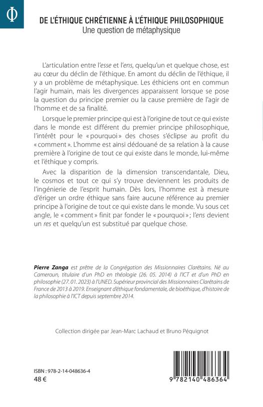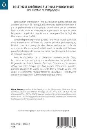 L'articulation entre l'esse et l'ens, quelqu'un et quelque chose, est au coeur du déclin de l'éthique. En amont de ce déclin, il y a un problème de métaphysique. Les éthiciens ont en commun l'agir humain, mais les divergences apparaissent lorsque se pose la question du principe premier ou la cause première de l'agir de l'homme et de sa finalité. Lorsque le premier principe qui est à l'origine de tout ce qui existe dans le monde est différent du premier principe philosophique, l'intérêt pour le pourquoi des choses s'éclipse au profit du comment . L'homme est ainsi dédouané de sa relation à la cause première à l'origine de tout ce qui existe dans le monde, lui-même et l'éthique y compris. Avec la disparition de la dimension transcendantale, Dieu, le cosmos et tout ce qui s'y trouve deviennent les produits de l'ingénierie de l'esprit humain. Dès lors, l'homme est en mesure d'ériger un ordre éthique sans faire aucune référence au premier principe. Vu sous cet angle, le comment finit par fonder le pourquoi; l'ens devient un res et quelqu'un est substitué par quelque chose.