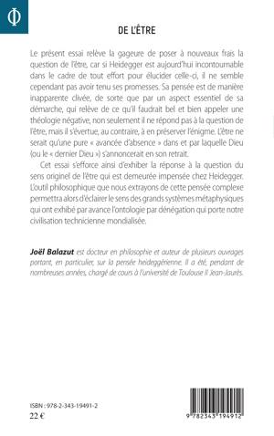 Cet ouvrage pose à nouveaux frais la question de l'être, car si Heidegger est aujourd'hui incontournable, il ne semble pas avoir tenu ses promesses. Sa pensée est en réalité clivée, de sorte qu'il ne répond pas à la question de l'être et s'évertue, au contraire, à en préserver l'énigme. Nous nous efforcerons d'exhiber la réponse à la question du sens originel de l'être demeurée impensée chez Heidegger. L'outil philosophique que nous extrayons de cette pensée permettra d'éclairer les grands systèmes métaphysiques et de faire la critique de la civilisation technicienne mondialisée.